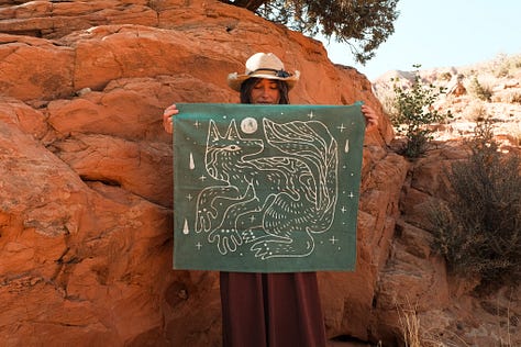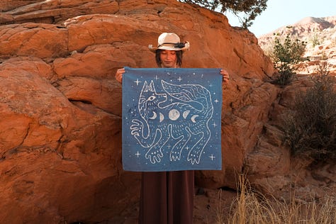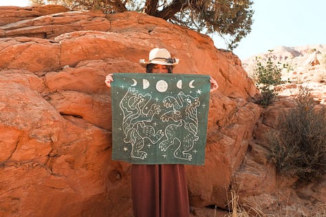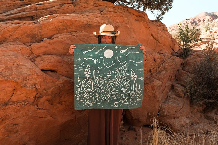 My work continues to be deeply inspired by time spent in remote wilderness spaces. The critters and plants of the desert are always my main focus, but lately, I’ve been exploring the feeling of the sky more within my work especially the hours between sunset and sunrise. The desert changes so much during that window. Colors shift, shadows stretch, and everything comes alive in a different way.