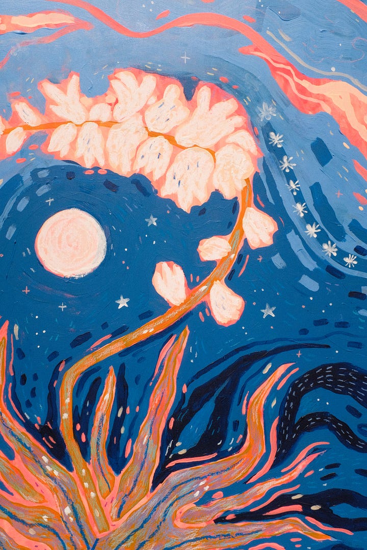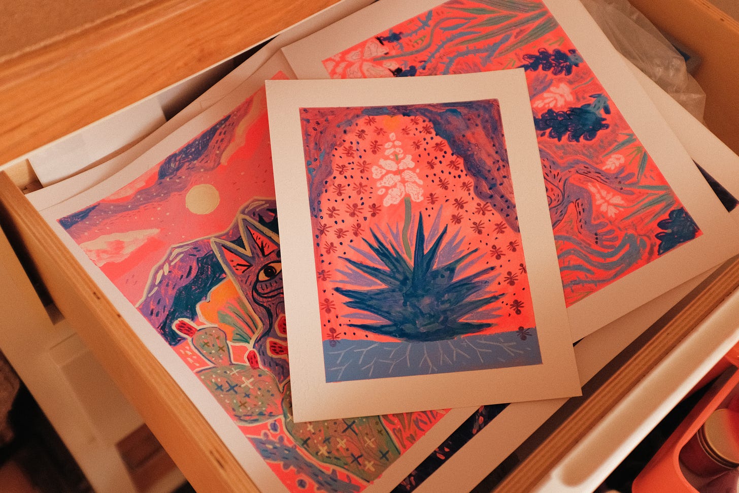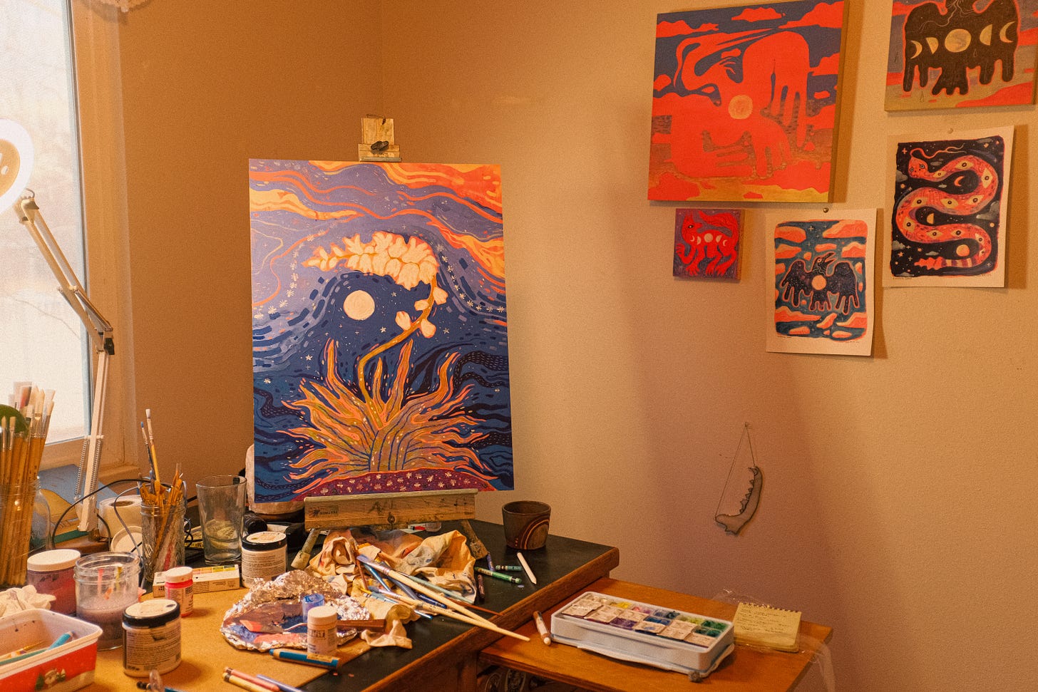now that we have gotten through my tangled emotions about painting, here’s some of the stuff. I like to use <3. My paintings are primarily mixed-media works. When I create traditionally, I rarely limit myself to just one medium! I love the variety and the tactile experience of working with different textures. When I moved into my van, I ended up gifting away almost all my art supplies to close friends. Now, I’m slowly rebuilding my collection, bit by bit, I’m someone who likes to pick supplies out in person—I need to feel them in my hands. So, whenever we make trips to major cities, I try to pick something up. For context, the closest Blick is a five-hour drive away!